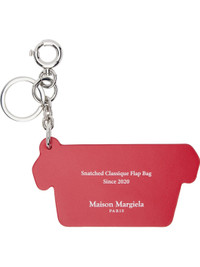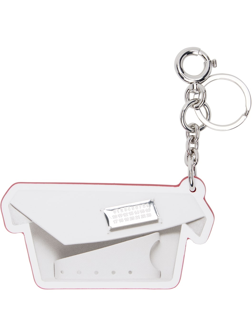 Buffed calfskin keychain in white. · Burnished edges in red · Logo graphic printed at face · Text and logo printed at back face · Keyring and spring-ring fastening · Silver-tone hardware · H7.25" x W2.5" Supplier color: Grey/Haute red Calfskin. Made in Italy 242168F025000
