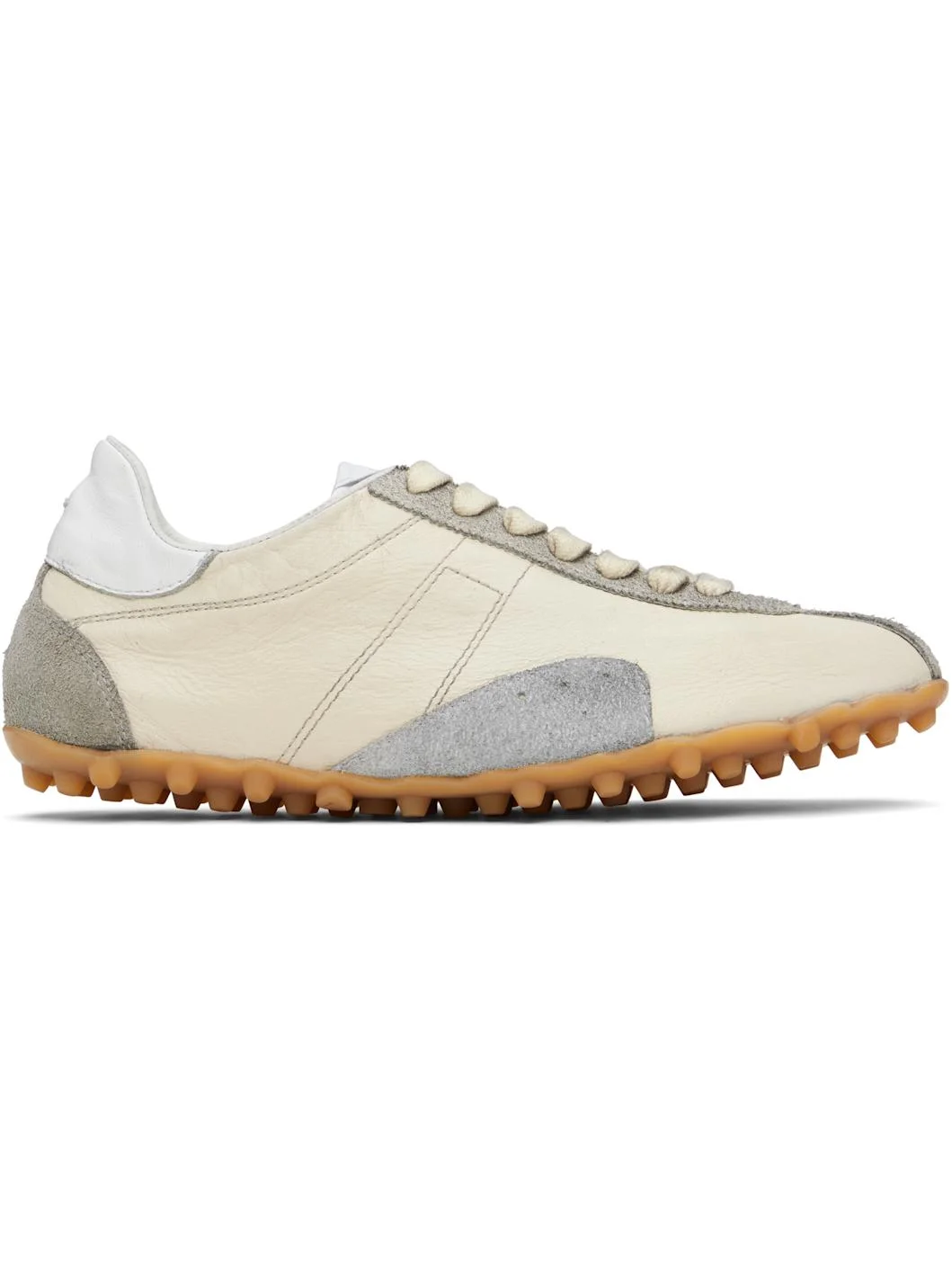 Low-top creased goatskin and calfskin suede sneakers. · Smudging throughout · Lace-up closure · Logo patch at padded tongue · Perforated detailing at outer side · White stitch at heel tab · Grained calfskin and moleskin lining · Treaded rubber sole Supplier color: Cream Upper: goatskin, calfskin. Sole: rubber. Made in Italy 261168F128003