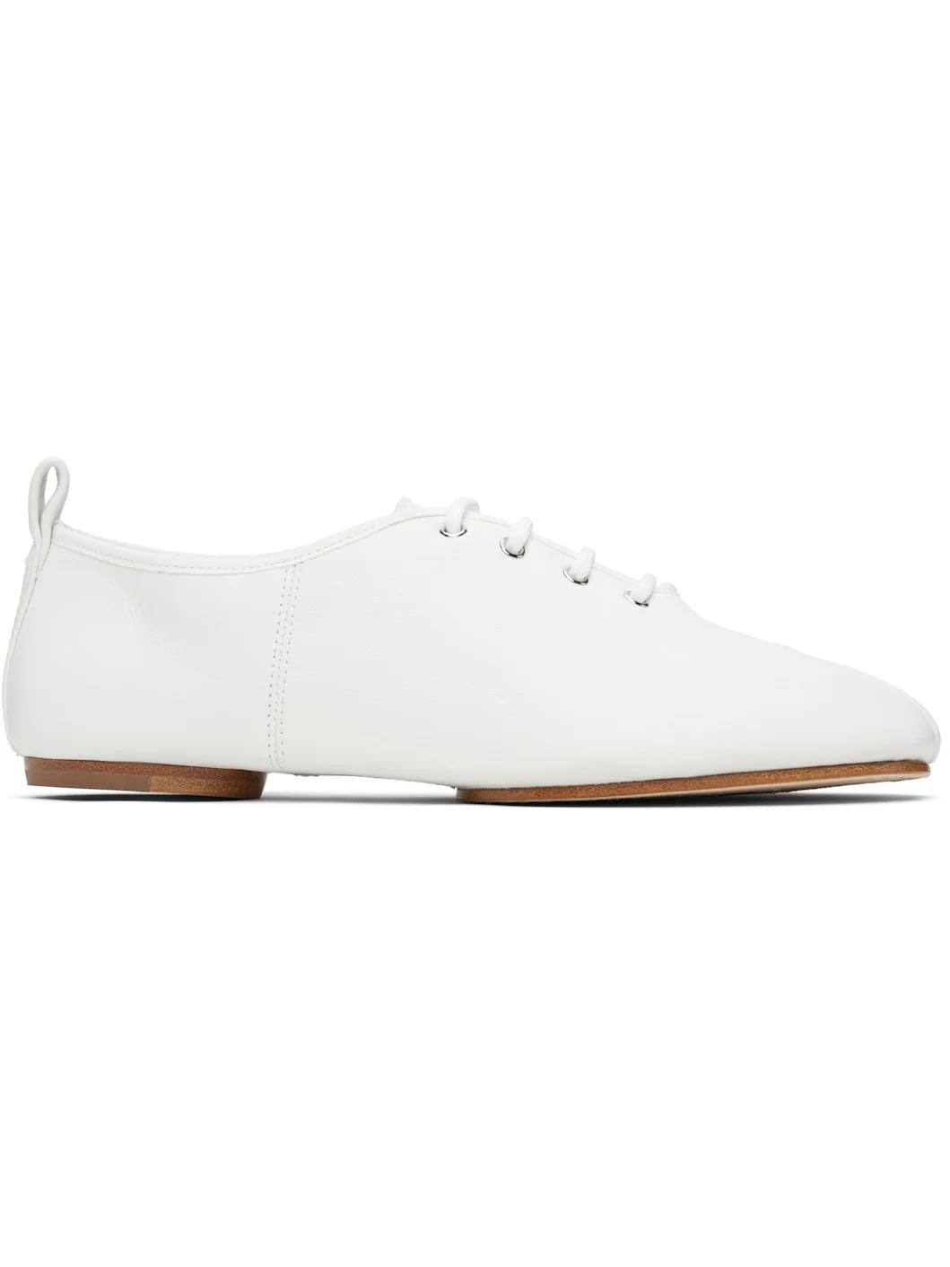 Grained sheepskin derbys. · Cleft toe · White stitching at vamp and heel collar · Lace-up closure · Pull-loop at heel collar · Faux-suede lining · Calfskin nubuck sole with rubber injection Supplier color: White Upper: sheepskin. Sole: calfskin. Made in Italy 261168F120001