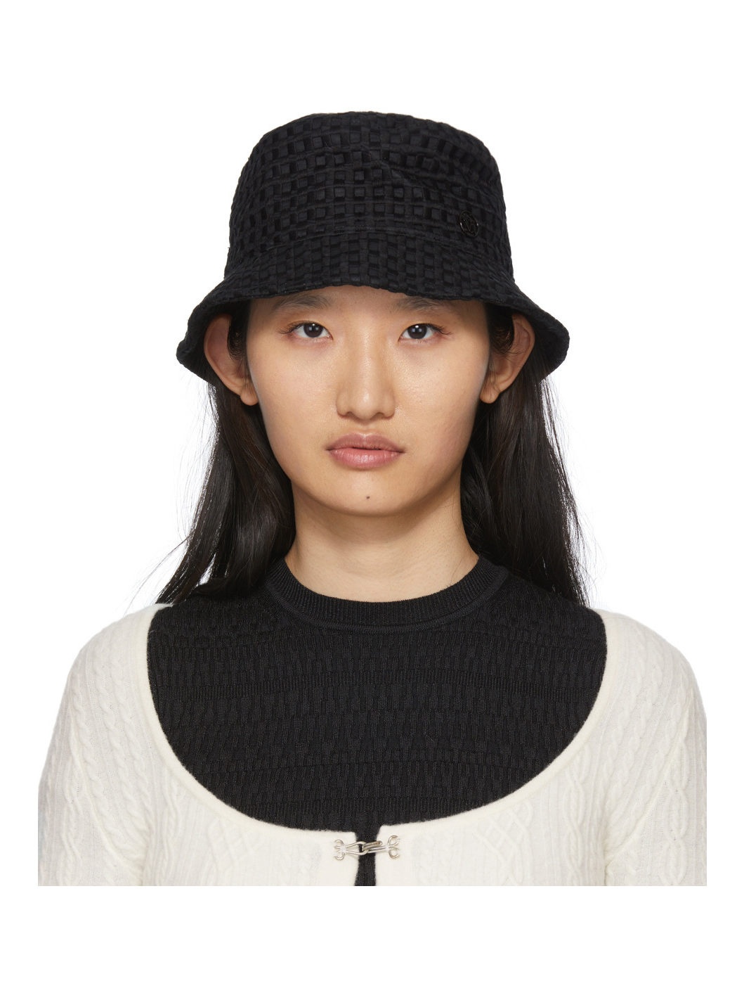Handcrafted black woven cotton-blend beach hat featuring threaded detailing in check pattern throughout. Tonal logo hardware at side. · Grosgrain browband at interior · Cotton lawn lining Supplier color: Black Body: 90% cotton, 10% polyester. Lining: 100% cotton. Made in Italy 221740F015000