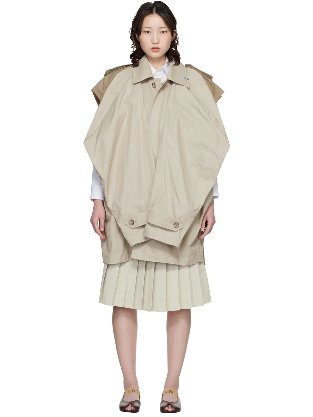 Cotton gabardine trench coat. · Integrated coat-and-vest construction · Spread collar · Button closure · Logo patch at collar, placket, and front hem · Welt pockets at waist · Belt loops and detachable pin-buckle belt · Epaulets · Raglan sleeves · Button tab at cuffs · Raw edge at cuffs and back hem · Storm flap at back · Pleat at back hem · Unlined Supplier color: Beige 100% cotton. Made in Japan 261551F067000