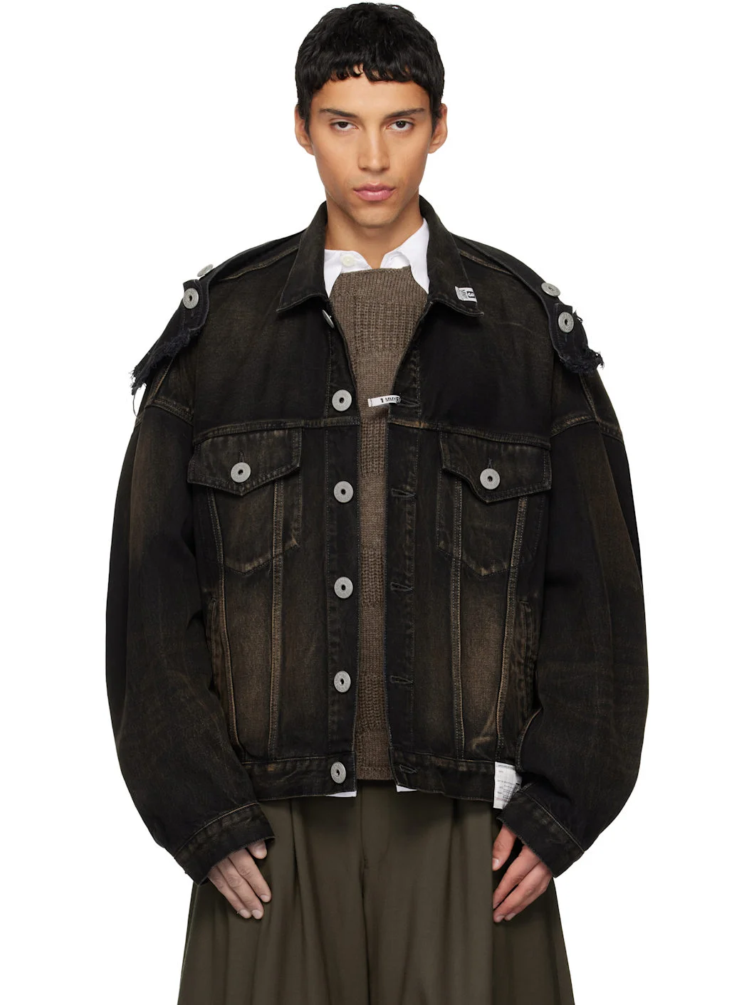 Non-stretch denim jacket. · Fading, whiskering, and distressing throughout · Logo patch at spread collar · Logo flag at button closure · Flap pockets at chest · Welt pockets at waist · Logo patch at front hem · Epaulets · Integrated jacket-style panel with printed text at back · Button tabs at back hem · Patch pocket at interior · Logo-engraved silver-tone hardware Supplier color: Black 100% cotton. Made in Japan 252551M177003