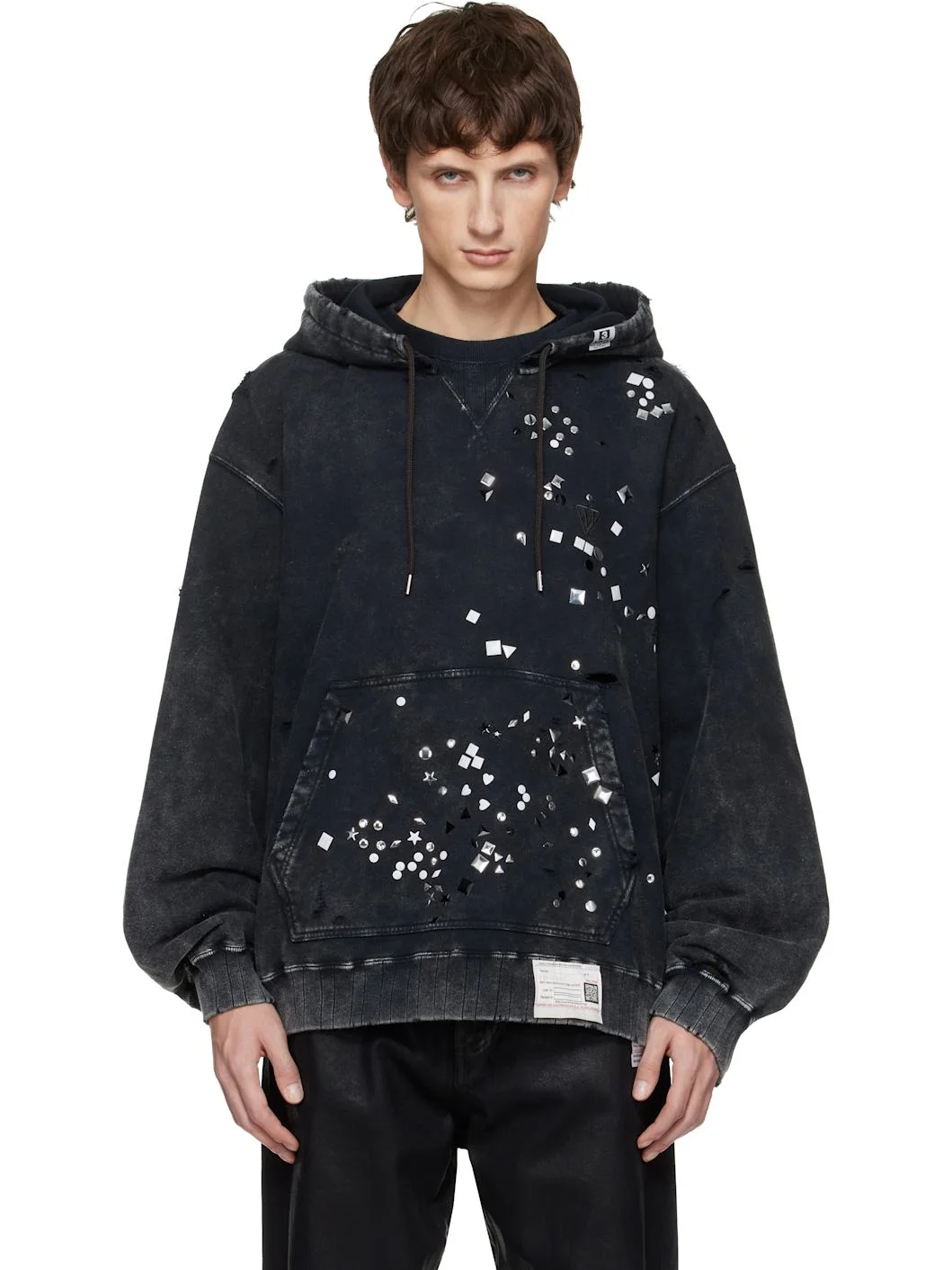 French terry hoodie. · Distressing, fading, and crystal-cut accents throughout · Drawstring and logo flag at hood · Kangaroo pocket at waist · Logo patch at front hem · Rib-knit hem and cuffs · Dropped shoulders Supplier color: Black 100% cotton. Made in Japan 252551M202007