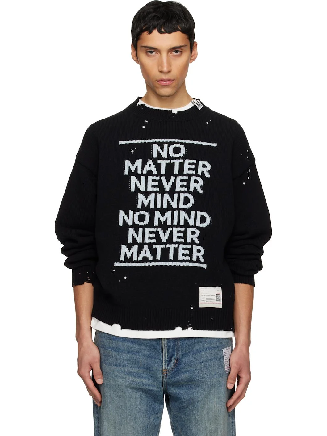 Knit cotton-blend sweater. · Distressing throughout · Rib-knit crewneck, hem, and cuffs · Logo flag at collar · Jacquard text at front · Logo patch at front hem Supplier color: Black 50% cotton, 50% acrylic. Made in Japan 261551M204002