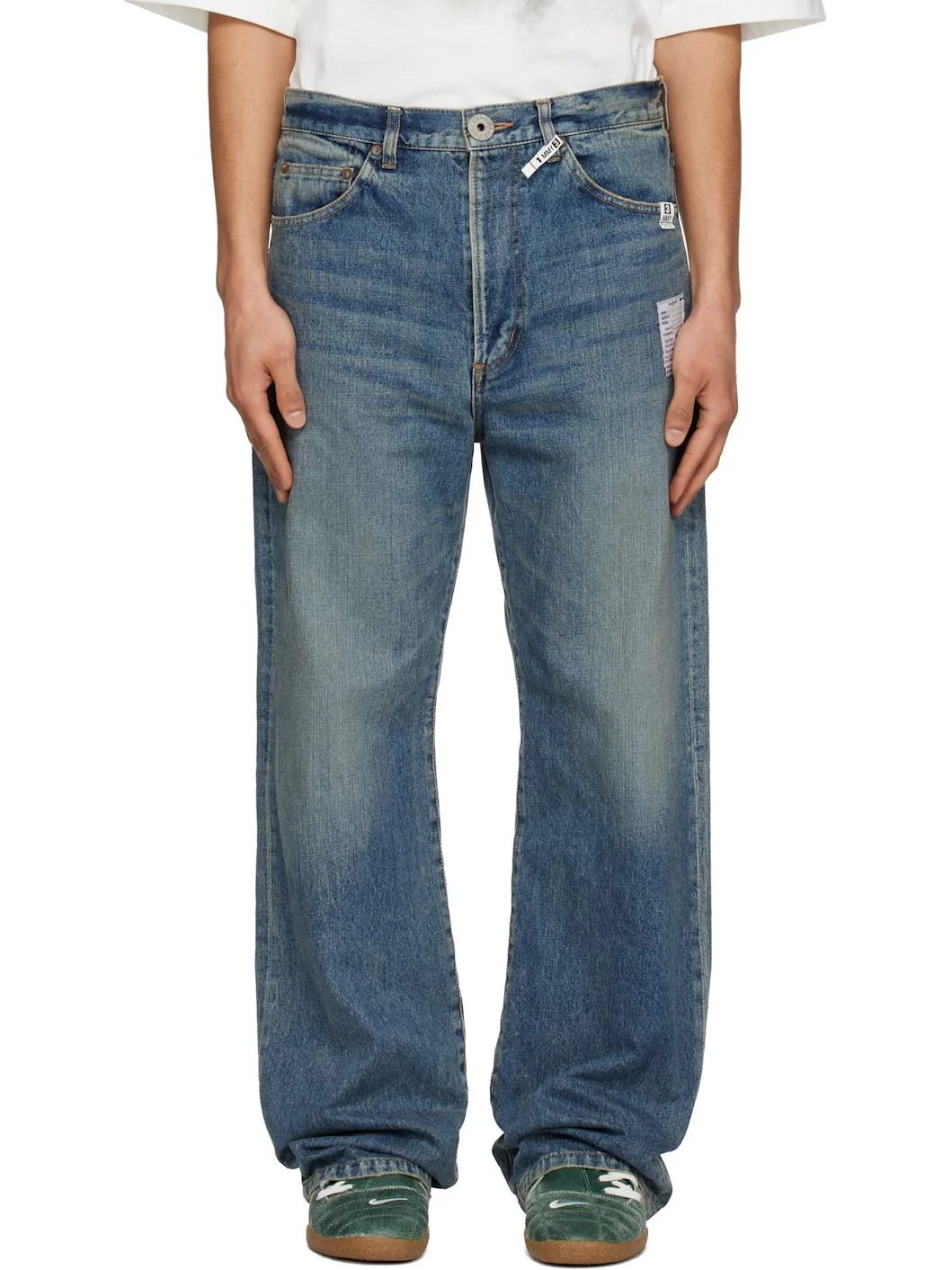 Flared non-stretch denim jeans. · Fading and whiskering throughout · Concealed drawstring and belt loops at waistband · Four-pocket styling · Zip fly · Logo flag and logo patch at front · Logo patch at back pocket · Contrast stitching in tan Supplier color: Indigo 100% cotton. Made in Japan 261551M186000