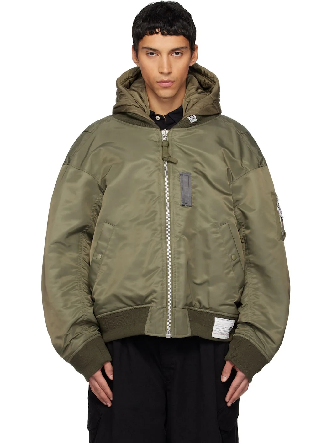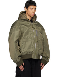 Oversized padded nylon taffeta bomber jacket. · Quilted ripstop hood at rib-knit stand collar · Zip closure · Webbing strap at chest · Welt pockets at waist · Logo patches and press-stud tabs at front · Rib-knit hem and cuffs · Dropped shoulders · Utility pocket at sleeve · Welt pockets at interior · Full quilted ripstop lining Supplier color: Khaki Body: 100% nylon. Trim: 100% wool. Fill: 100% polyester. Lining: 100% nylon. Made in Japan 252551M175000