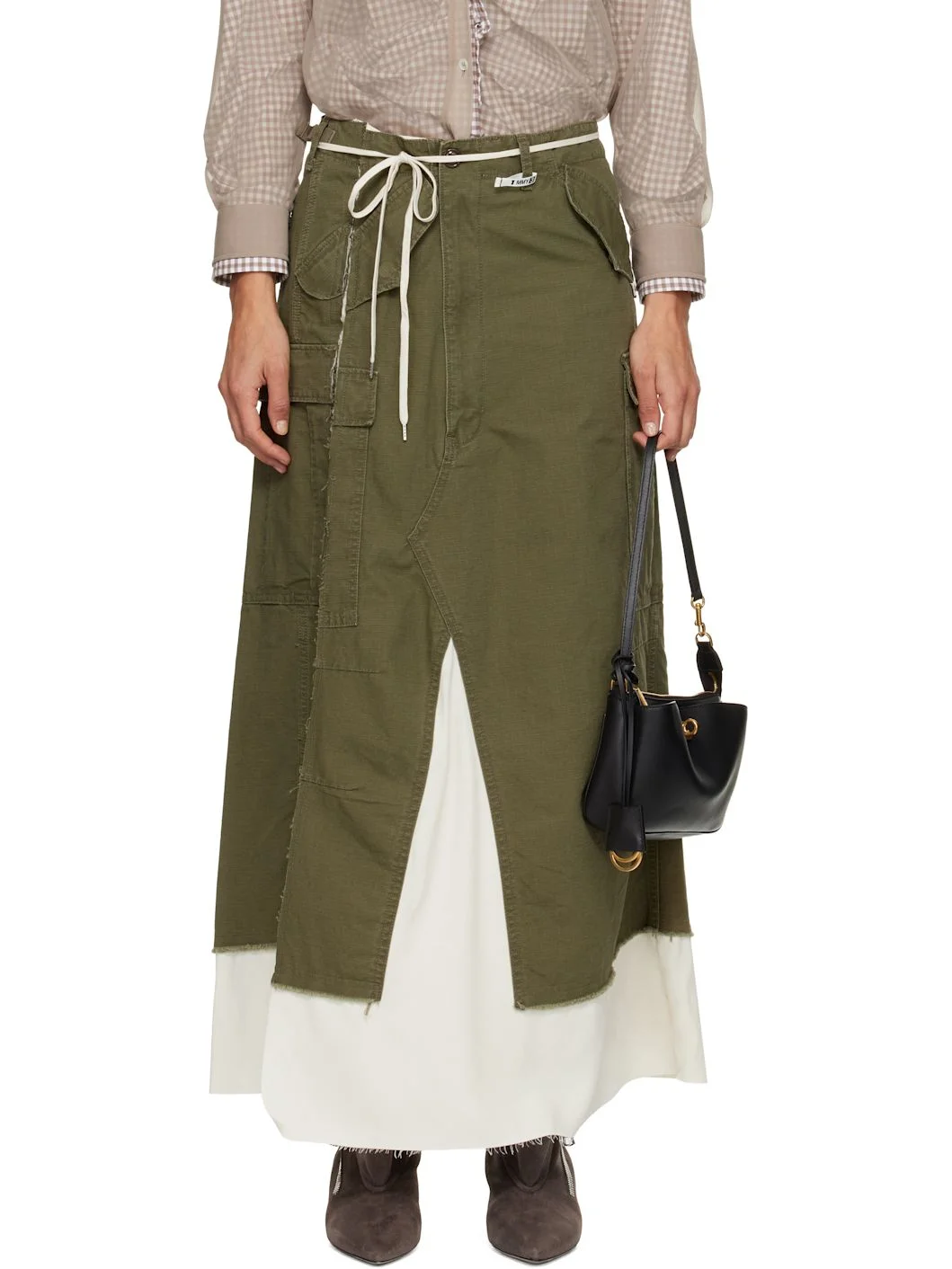 Cotton ripstop and viscose twill midi skirt. · Raw edges throughout · Paneled construction · Belt loops and detachable self-tie belt at waistband · Four-pocket styling · Zip fly · Cinch strap at waistband side seams · Cargo pocket at side seams · Logo patch at back Supplier color: Khaki Body 1: 100% cotton. Body 2: 100% viscose. Made in Japan 252551F092002
