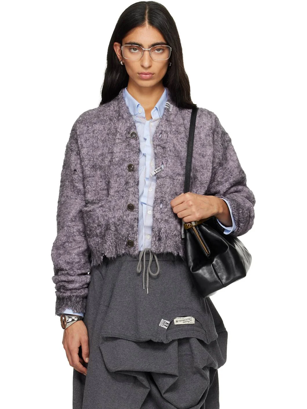 Knit cotton-blend cardigan. · Distressing throughout · Logo flag at V-neck · Button closure · Welt pockets and logo patch at front Supplier color: Purple 65% cotton, 20% mohair, 10% nylon, 5% wool. Made in Japan 252551F095000