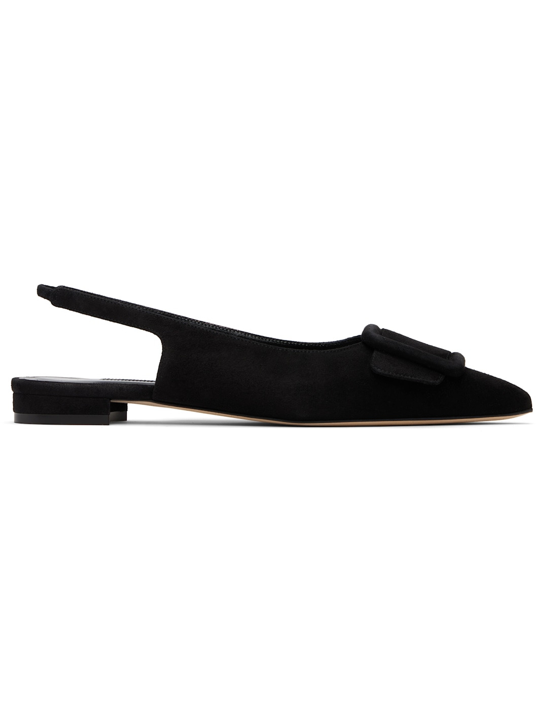 Handcrafted goatskin suede sandals. · Pointed toe · Covered buckle hardware at vamp · Partially elasticized slingback strap · Inset logo patch at padded footbed · Covered heel with rubber injection · Calfskin nubuck sole Supplier color: Black Upper: goatskin. Sole: calfskin. Made in Italy 252140F118004