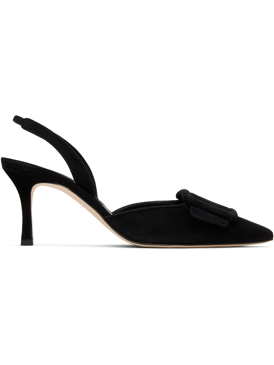 Handcrafted goatskin suede heeled sandals. · Pointed toe · Covered buckle hardware at vamp · Partially elasticized slingback strap · Inset logo patch at padded footbed · Covered stiletto heel with rubber injection · Calfskin nubuck sole · Heel: H2.75" Supplier color: Black Upper: goatskin. Sole: calfskin. Made in Italy 252140F122003