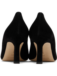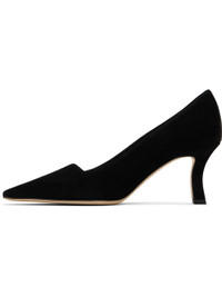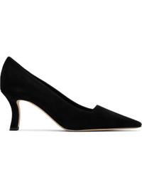 Handcrafted kidskin suede heels. · Pointed square toe · Covered stiletto heel with rubber injection · Suede sole · Heel: H3" Supplier color: Black Upper: kidskin. Sole: leather, rubber. Made in Italy 252140F122024