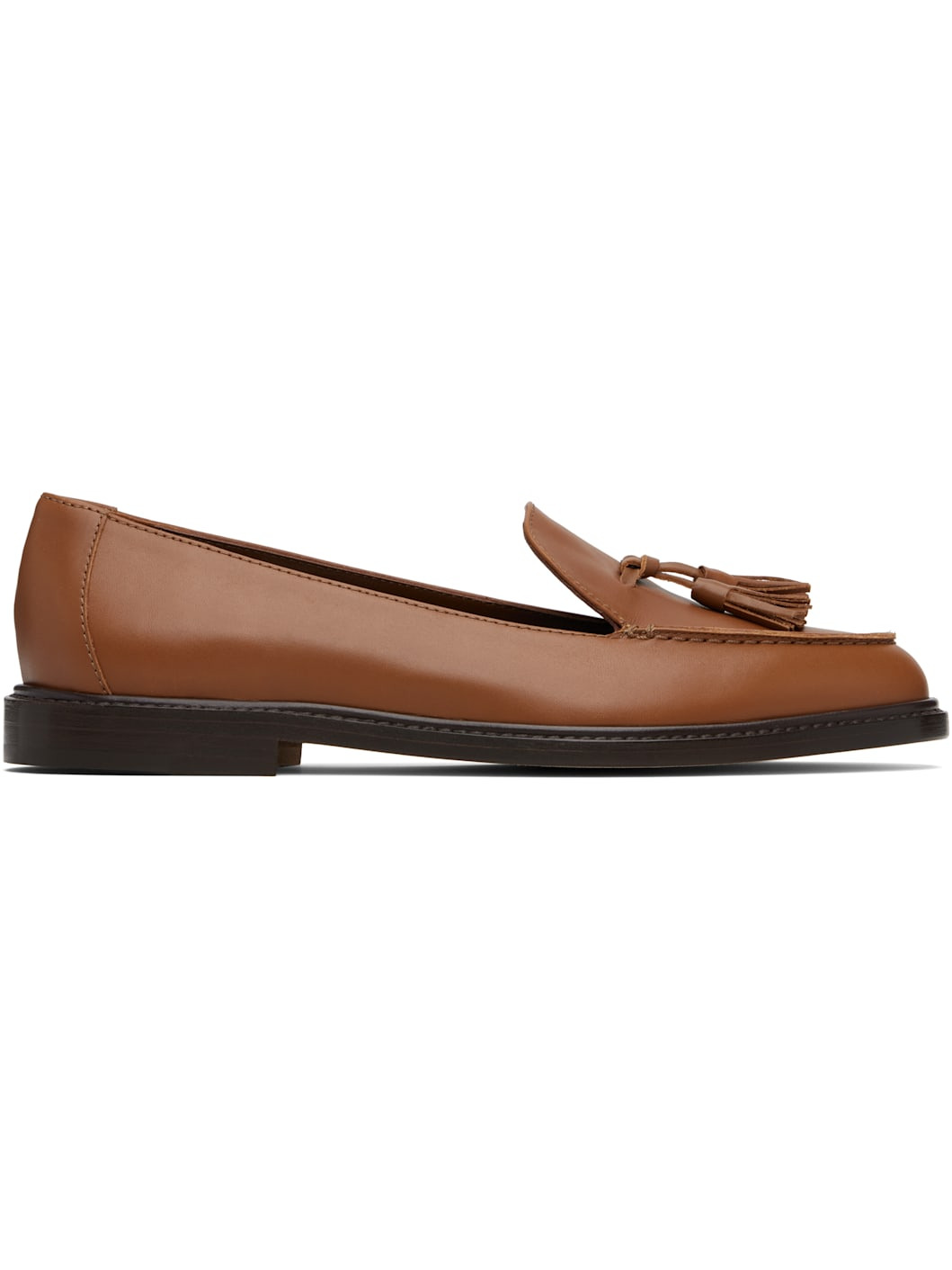 Handcrafted buffed calfskin loafers. · Moc toe · Tassels at vamp · Buffed goatskin lining · Stacked leather heel with rubber injection · Calfskin nubuck sole Supplier color: Brown Calfskin. Made in Italy 252140F121002