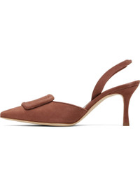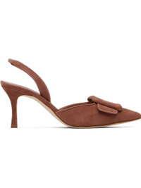 Handcrafted goatskin suede heels. · Pointed toe · Covered buckle hardware at vamp · Partially elasticized slingback strap · Inset logo patch at padded footbed · Covered stiletto heel with rubber injection · Calfskin nubuck sole · Heel: H2.75" Supplier color: Brown Upper: goatskin. Sole: calfskin. Made in Italy 252140F122016
