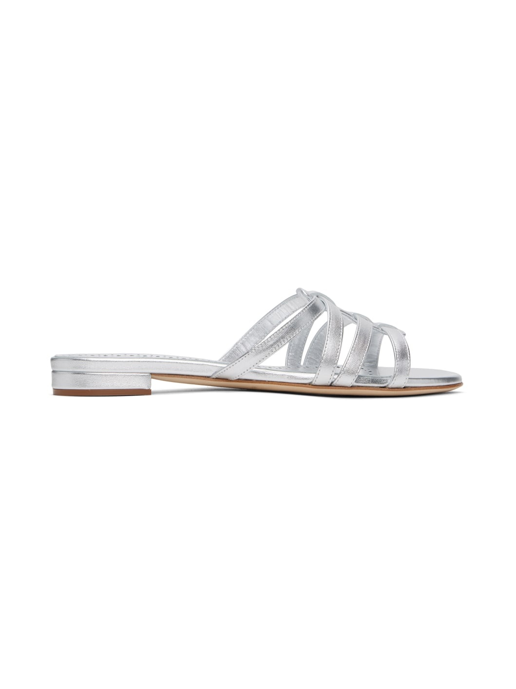 Handcrafted nappa lambskin flat sandals in silver tone. · Open toe · Crisscrossing straps at vamp · Perforated detailing at grained leather footbed · Covered block heel with rubber injection · Suede sole Supplier color: Silv Upper: lambskin. Sole: calfskin. Made in Italy 241140F124010