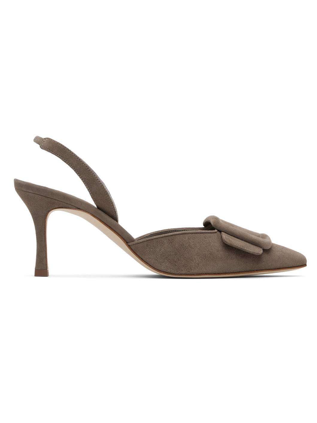 Handcrafted goatskin suede heeled sandals. · Pointed toe · Covered buckle hardware at vamp · Partially elasticized slingback strap · Inset logo patch at padded footbed · Covered stiletto heel with rubber injection · Calfskin nubuck sole · Heel: H2.75" Supplier color: Light brown Upper: goatskin. Sole: calfskin. Made in Italy 252140F122037