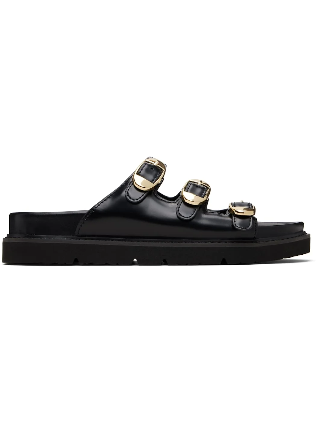 Buffed leather flat sandals. · Open toe · Pin-buckle straps at vamp · Logo printed at molded footbed · Foam rubber midsole · Treaded rubber sole Part of THE™ collection. Supplier color: Black Upper: leather. Sole: rubber. Made in Cambodia 261190F124002