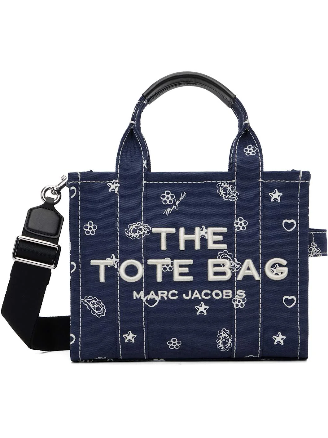 Cotton canvas tote. · Graphic pattern printed throughout · Twin rolled carry handles · Adjustable and detachable crossbody strap · Logo and text embroidered at face · Loop at side · Logo patch at back face · Zip closure · Faille lining · Contrast stitching in white · H8" x W10" x D5" Part of THE™ collection. Supplier color: Navy Multi Textile. Made in Viet Nam 261190F049043