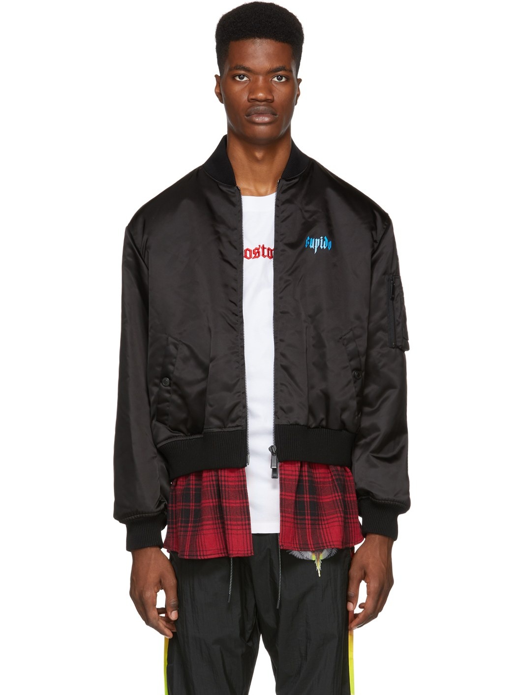 Long sleeve nylon satin bomber jacket in black. Cotton flannel trim featuring check pattern in black and red throughout. Rib knit stand collar, cuffs, and hem. Two-way zip closure at front. Text printed in blue at chest. Welt pockets at waist. Logo printed in blue and zippered pocket at sleeve. Multicolor logo and graphic printed at back. Extended shirttail hem. Fully-lined interior. Logo-engraved black hardware. Tonal stitching. Body 1: 100% polyamide. Body 2: 100% cotton. Trim: 88% cotton, 6% polyamide, 6% elastane. Lining 1: 100% viscose. Lining 2: 100% cotton. Padding: 100% polyester.