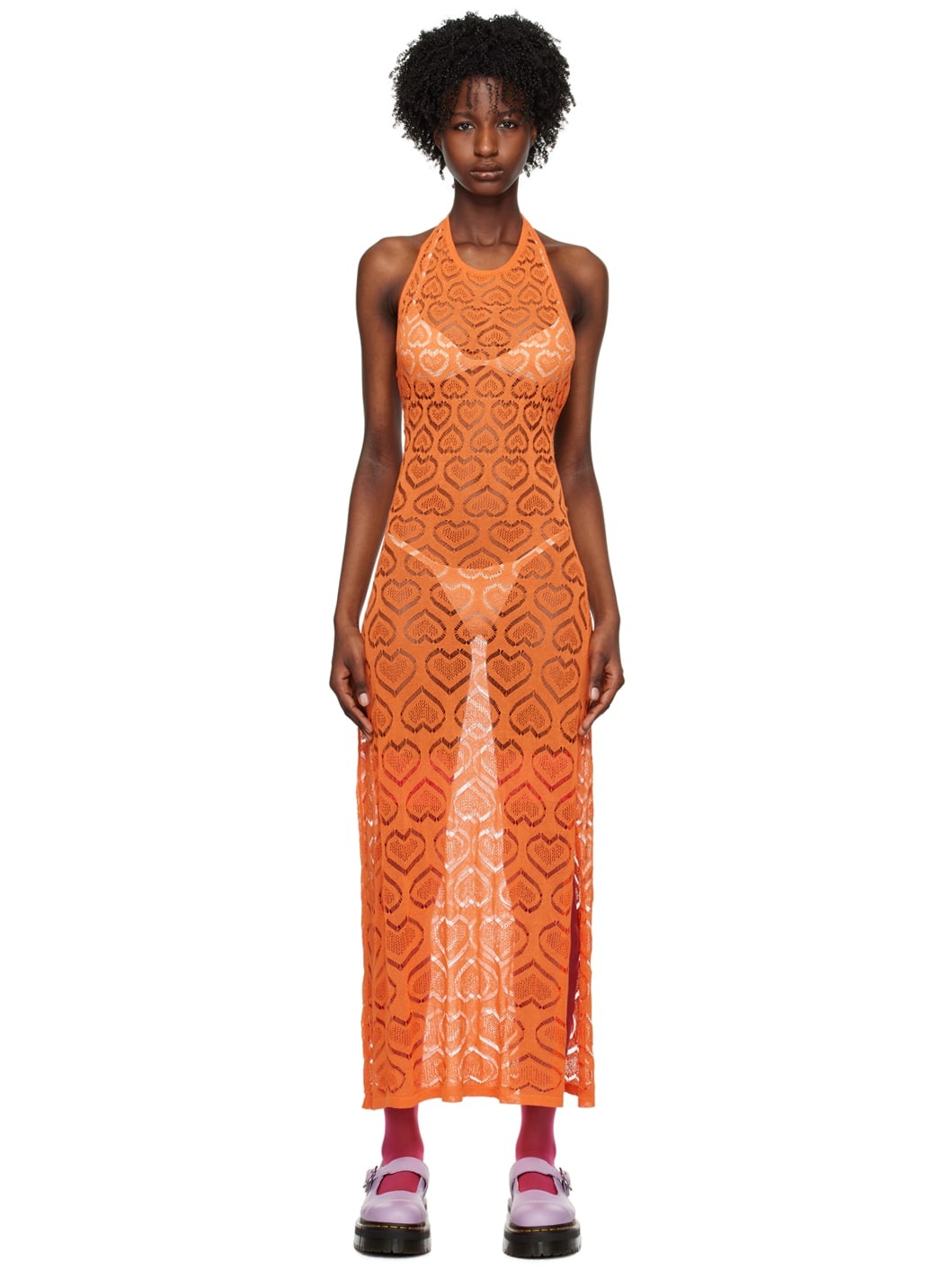 Semi-sheer raschel knit viscose-blend dress. Graphic pattern throughout. · Rib knit scoop neck and hem · Vented side seam · Self-tie halter strap · Self-tie fastenings at open back Available exclusively at SSENSE. Supplier color: Orange 88% viscose, 12% polyamide. Made in Italy 231761F055006