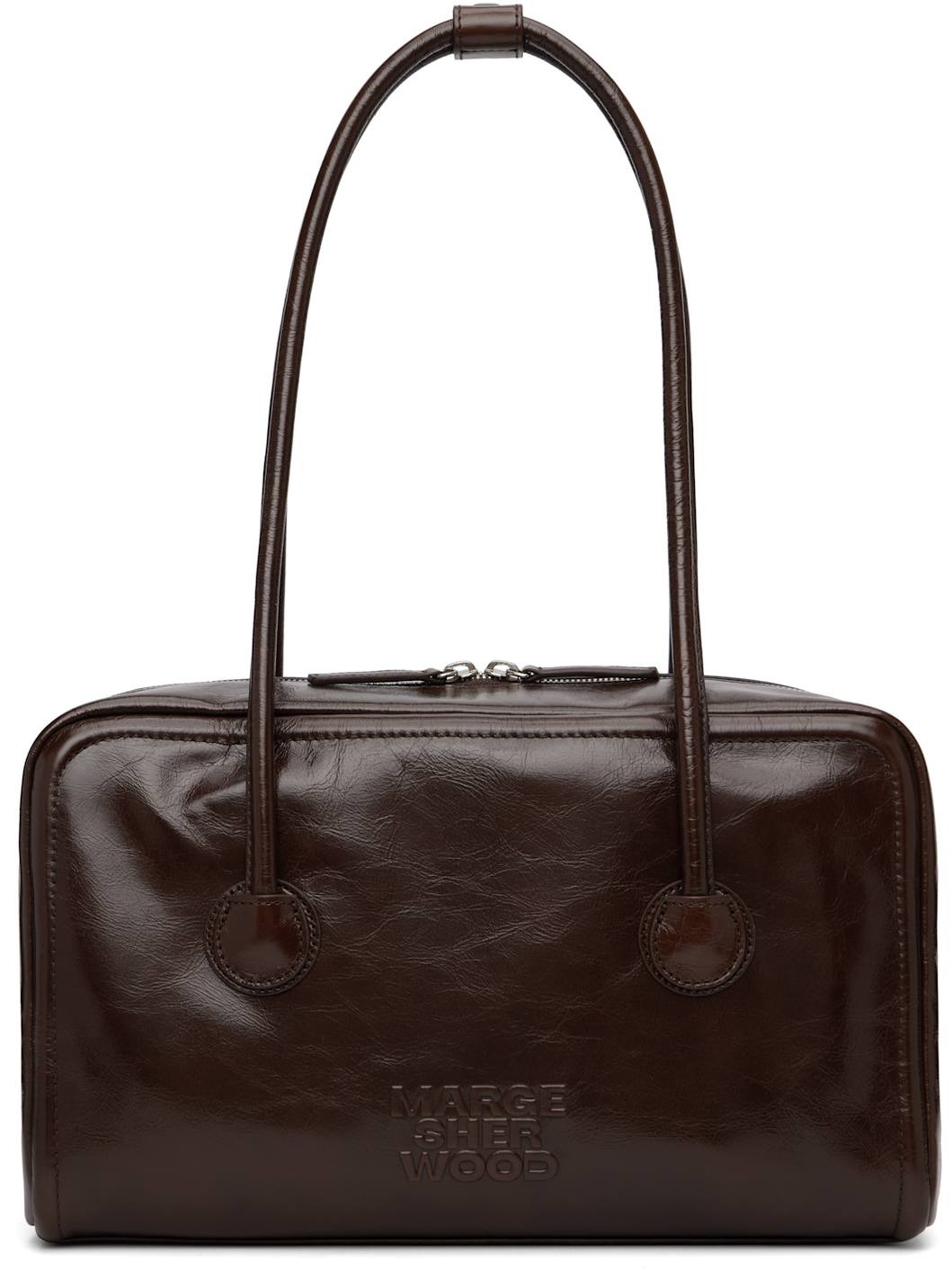 Crinkled leather top handle bag. · Press-stud tab at twin rolled shoulder straps · Logo embossed at face · Two-way zip closure · Zip pocket and patch pocket at interior · Logo-woven twill lining · H8" x W12.5" x D4" Supplier color: Mocha crinkle Leather. Made in South Korea 252369F046010