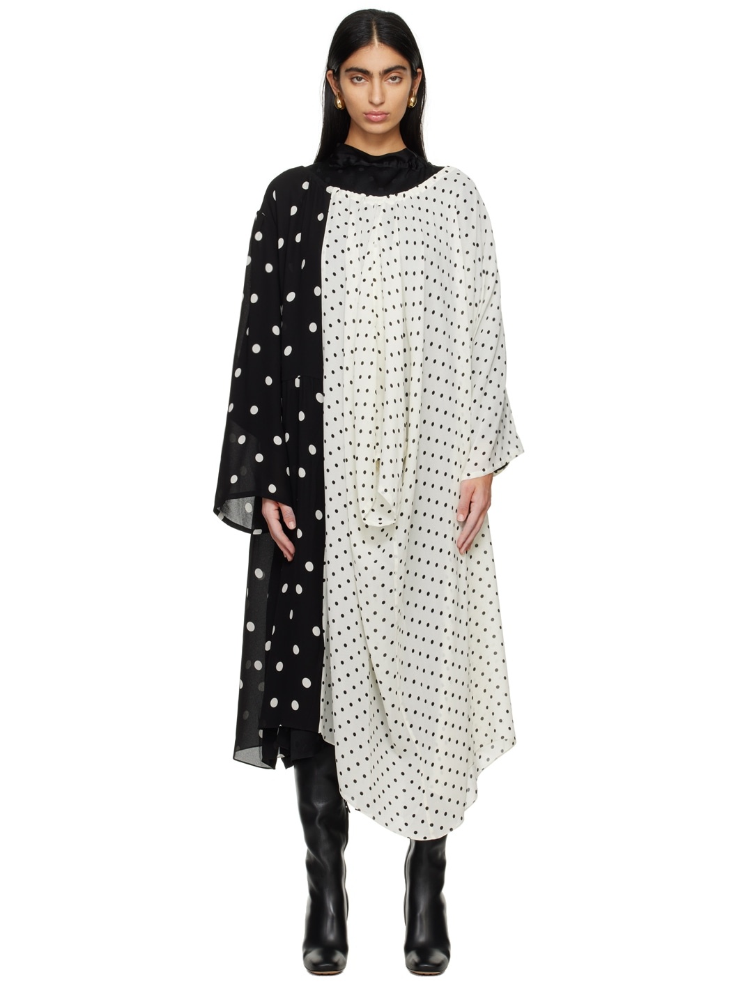 Viscose crepe and silk twill dress. Polka dots throughout. · Asymmetrical, wrap, and layered construction · Self-tie fastening at mock neck · Detachable belt and belt loops at waist · Gathering at waist and shoulders Supplier color: Variable polka dots Body 1: 100% viscose. Body 2: 100% silk. Made in Romania 241808F054006