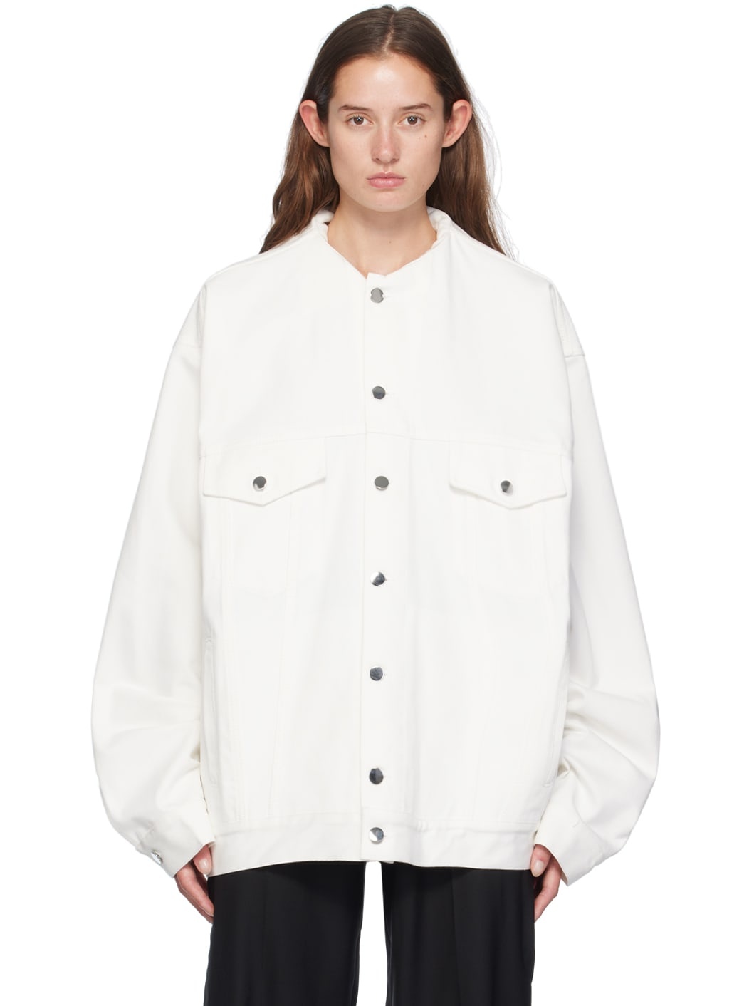 Non-stretch denim jacket. · Round neck with fixed rolled collar · Button closure · Flap and welt pockets · Dropped shoulders · Single-button barrel cuffs · Adjustable button-tabs at back hem · Silver-tone hardware Supplier color: White 100% cotton. Made in Romania 242189F060000
