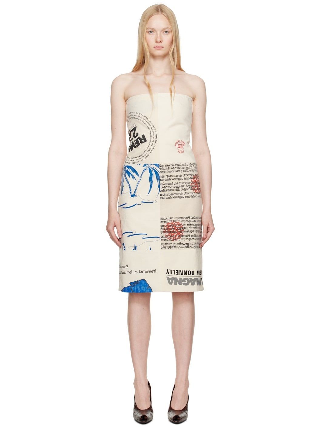 Upcycled cotton hopsack midi dress. Graphics and text printed throughout. · Straight neck · Stretch jersey gusset at side seams · Zip closure at back · Central vent at back hem · Full cotton poplin lining Each item is unique. Please note that graphics may vary. Supplier color: Regenerated tote bags ecru Body: 100% cotton. Trim: 78% recycled polyamide, 22% elastane. Lining: 100% cotton. Made in France 251020F054000