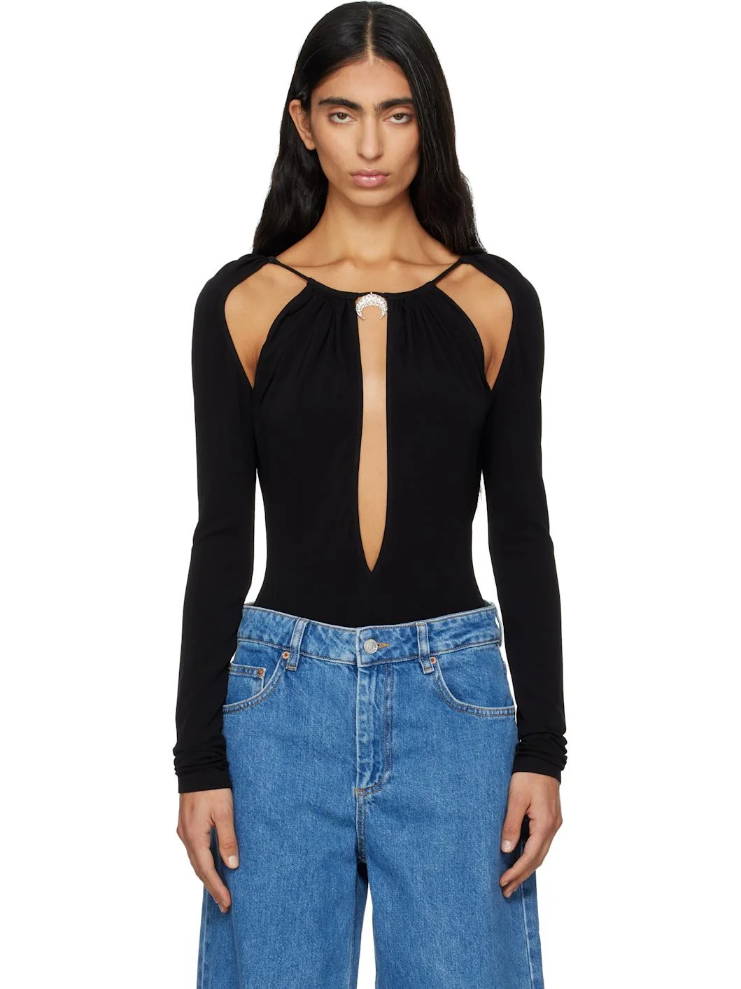 Stretch viscose jersey bodysuit. · Self-tie halter neck · Gathering at collar · Plunging keyhole at front and back · Crystal-cut hardware at front · Press-stud closure at bottom · Cutout at shoulders Supplier color: Black 95% viscose, 5% elastane. Made in France 252020F107000