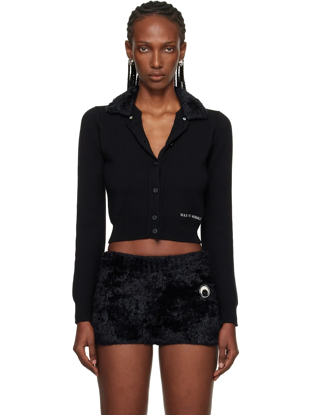 Knit merino wool cardigan. · FWS-certified merino wool · Detachable shag-knit spread collar · Rib-knit crewneck, placket, hem, and cuffs · Button closure · Intarsia logo at cropped front hem · Embroidered logo at back collar · Logo-engraved black hardware Supplier color: Black Body: 100% merino wool. Trim: 100% polyamide. Made in Italy 252020F095004