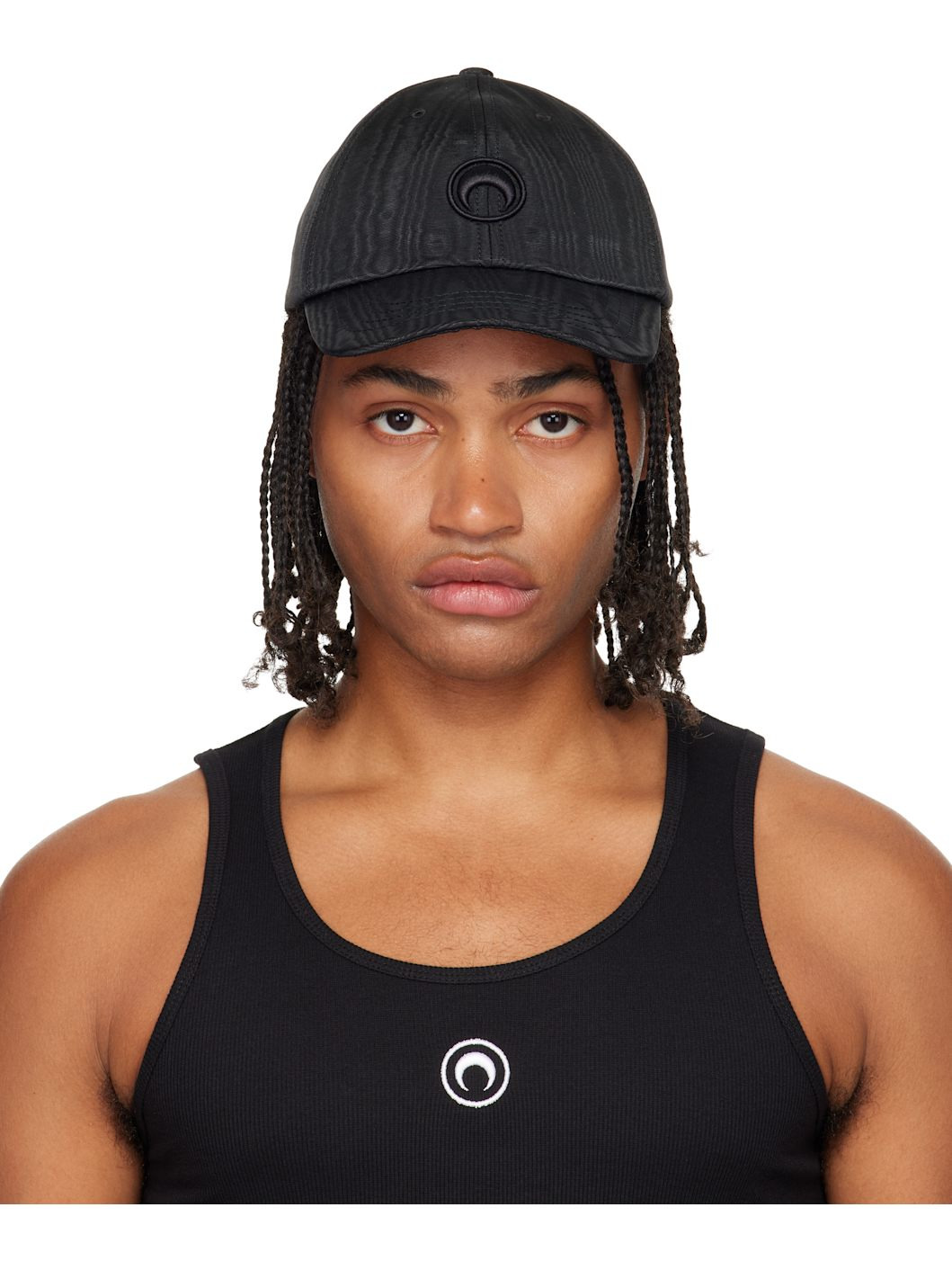 Moire cap. · Embroidered eyelets at crown · Logo embroidered at face · Curved brim · Cinch fastening · Twill lining Supplier color: Black/Black Body: 62% recycled polyester, 38% polyester. Lining: 100% cotton. Made in Bulgaria 252020M139004