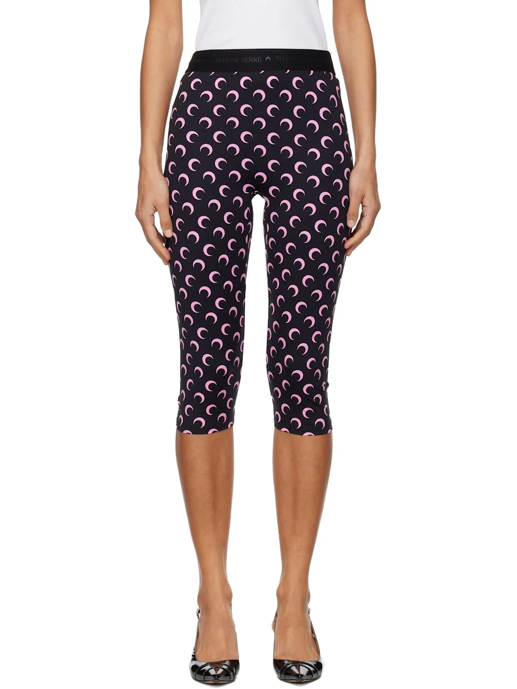 Stretch recycled nylon jersey capri leggings. · Logo pattern printed throughout · Jacquard logo at elasticized waistband Supplier color: Black/Pink 88% recycled polyamide, 12% recycled elastane. Made in Portugal 252020F085009