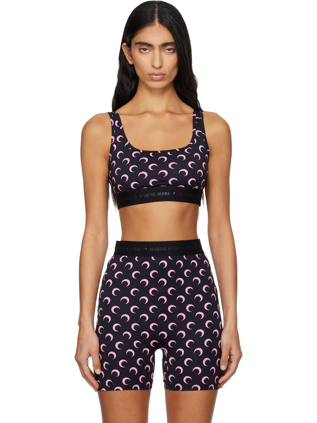 Stretch recycled nylon jersey sport bra. · Logo pattern printed throughout · Scoop neck · Fixed shoulder straps · Jacquard logo at elasticized waistband Wholesale exclusivity at SSENSE. Supplier color: Black/Pink 88% recycled polyamide, 12% recycled elastane. Made in Portugal 252020F511004