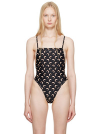 Stretch recycled nylon jersey one-piece swimsuit. Logo pattern printed throughout. · Square neck · Elasticized spaghetti straps · Open back · Fully lined Supplier color: Moon tan on black 78% recycled polyamide, 22% elastane. Made in Italy 251020F103001