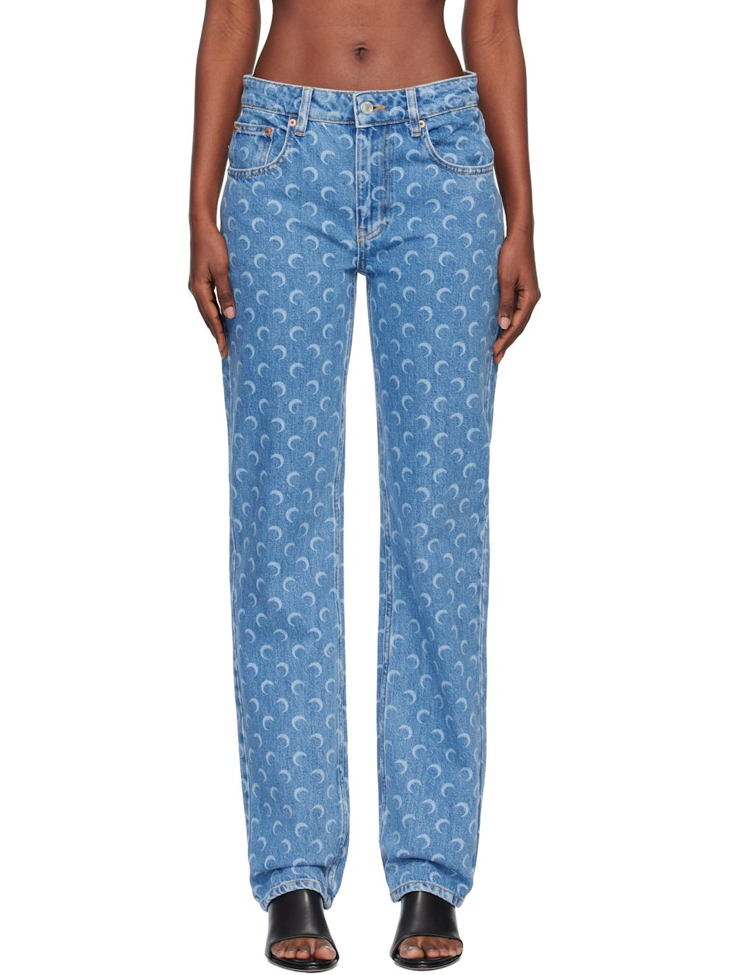 Non-stretch denim jeans. · Fading and printed logo pattern throughout · Straight-leg · Mid-rise · Belt loops · Five-pocket styling · Zip fly · Logo patch at back waistband · Contrast stitching in tan Supplier color: Moon laser denim blue 100% cotton. Made in Turkey 252020F069001