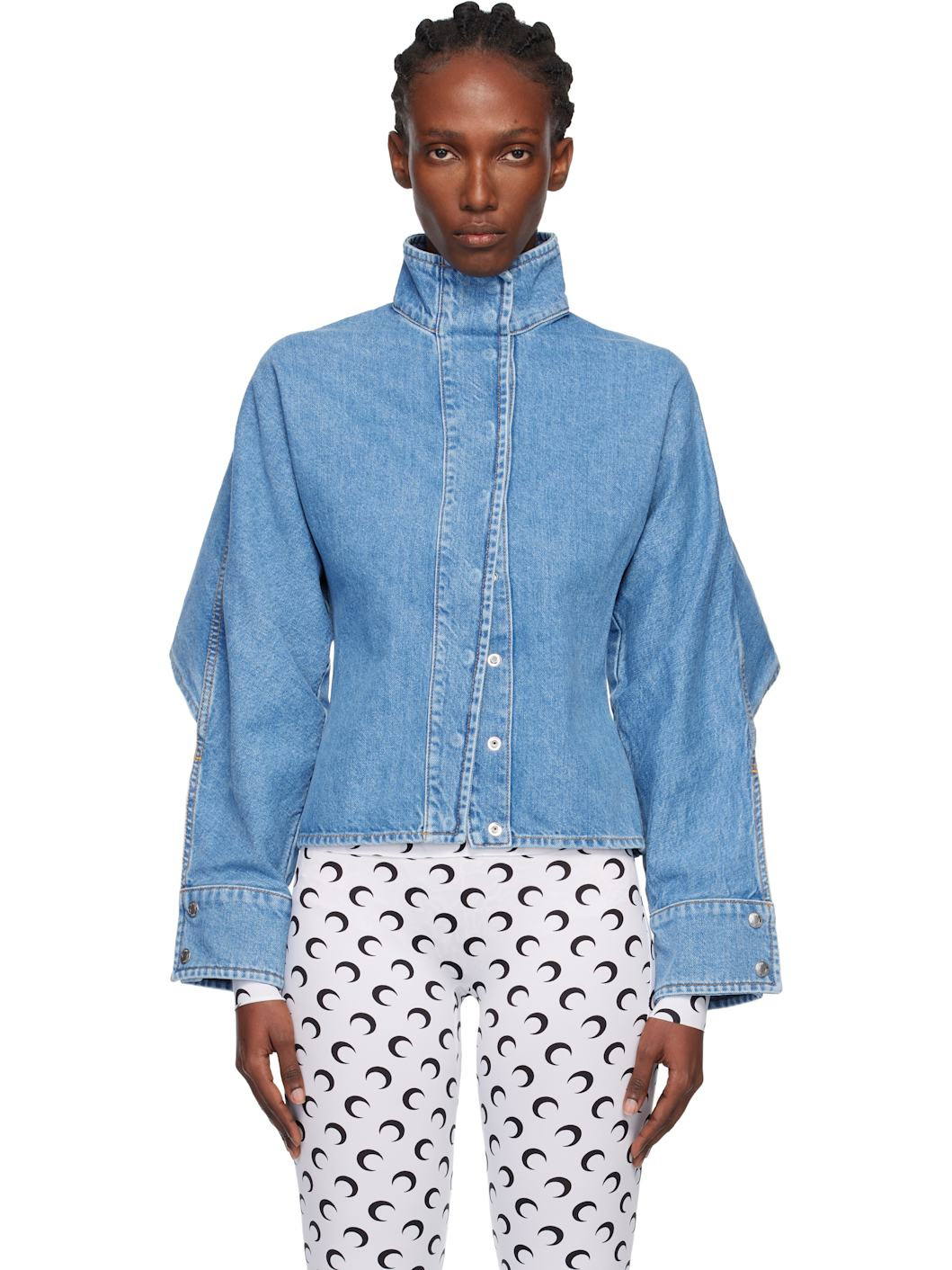 Non-stretch denim jacket. · Fading and printed logo pattern throughout · Funnel neck · Press-stud closure · Press-stud barrel cuffs · Logo patch at back collar · Storm flap at back · Contrast stitching in tan Supplier color: Moon laser denim blue 100% cotton. Made in Turkey 252020F060002