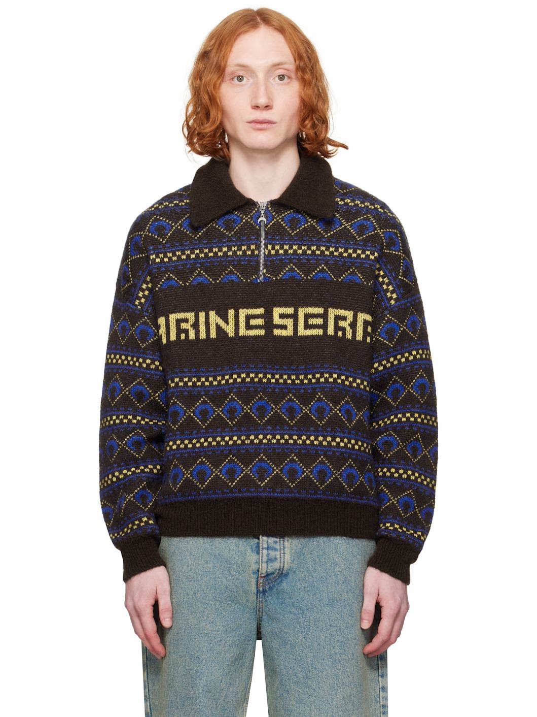 Knit mohair- and wool-blend sweater. Jacquard logo graphic pattern throughout. · Rib-knit spread collar, hem, and cuffs · Half-zip closure · Jacquard logo at front · Dropped shoulders Supplier color: Deep brown 43% mohair, 32% wool, 25% polyamide. Made in Romania 251020M204000