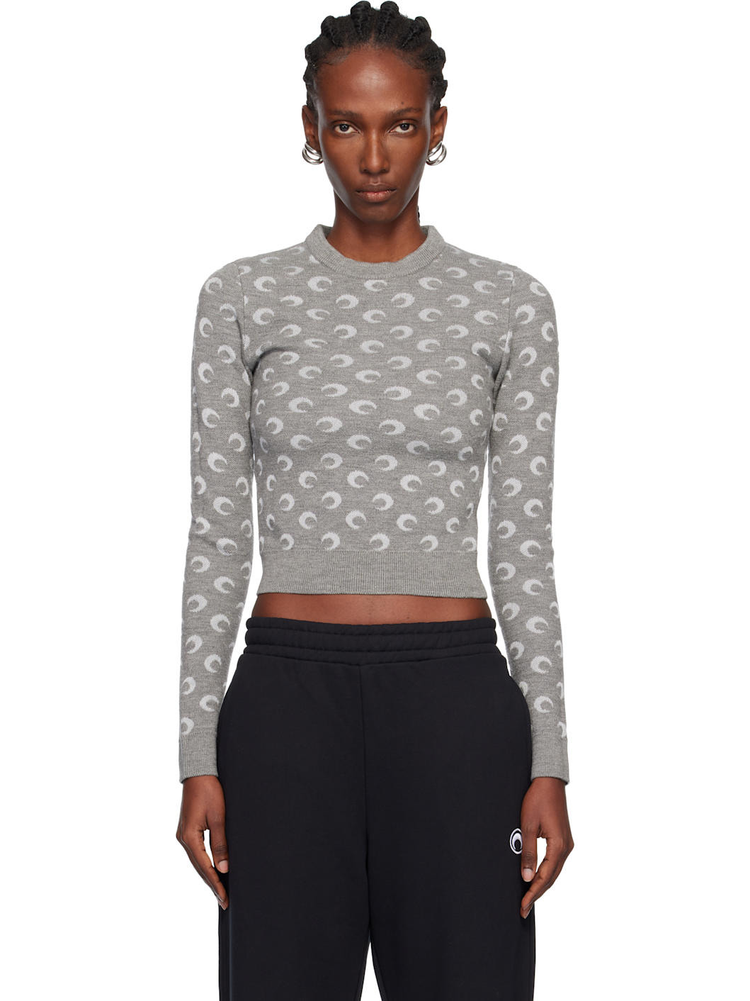 Gray Moon Jacquard Knit Fitted Crewneck Sweater
