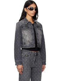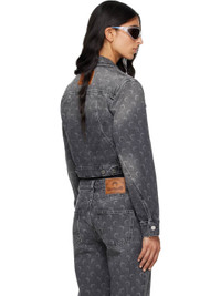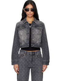 Non-stretch denim jacket. · Laser-printed logo pattern and fading throughout · Spread collar · Button closure · Flap pockets at chest · Seam pockets at waist · Cropped hem · Buttoned barrel cuffs · Jacron logo patch at back collar · Adjustable button tabs at back hem · Logo-engraved antiqued silver-tone hardware Supplier color: Moon laser grey denim 100% cotton. Made in Turkey 252020F060001