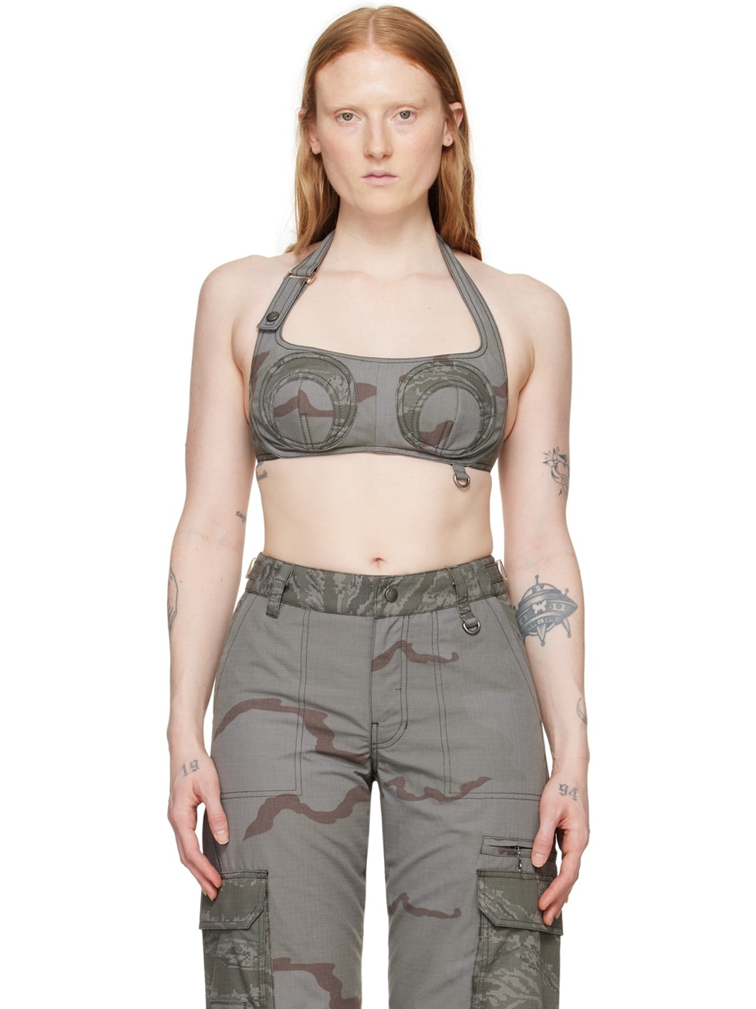 Upcycled polyester- and cotton-blend ripstop bra. Camouflage pattern printed throughout. · Paneled construction · Adjustable press-stud halter strap at square neck · Underwire at cups · Adjustable press-stud fastening at back · Logo-engraved gunmetal-tone hardware Supplier color: Dark grey Body: 64.5% polyester, 33% cotton, 2.5% viscose. Body 2: 69% viscose, 31% cotton. Made in Bulgaria 241020F111010