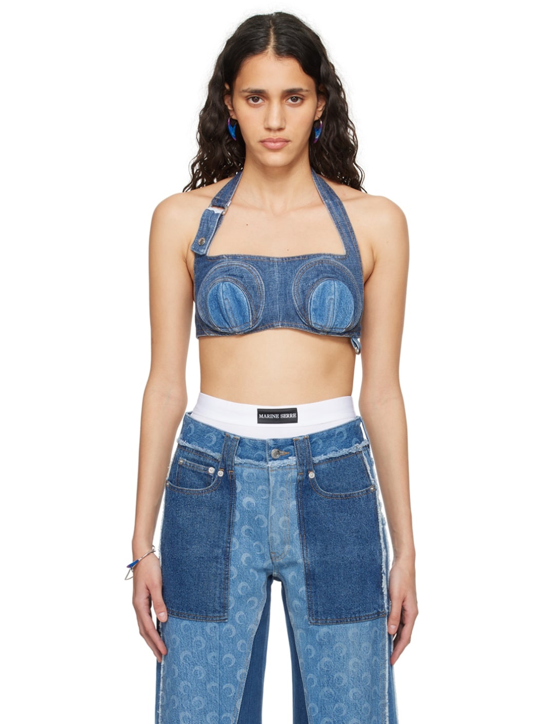 Non-stretch denim bra. Logo pattern printed throughout. · Logo applique at padded cups · D-ring at front hem · Adjustable halter strap · Press-stud fastening at back · Full plain-woven lining Part of the Gold Line collection. Supplier color: Navy Body: 100% cotton. Lining: 100% cotton. Made in Portugal 241020F111019