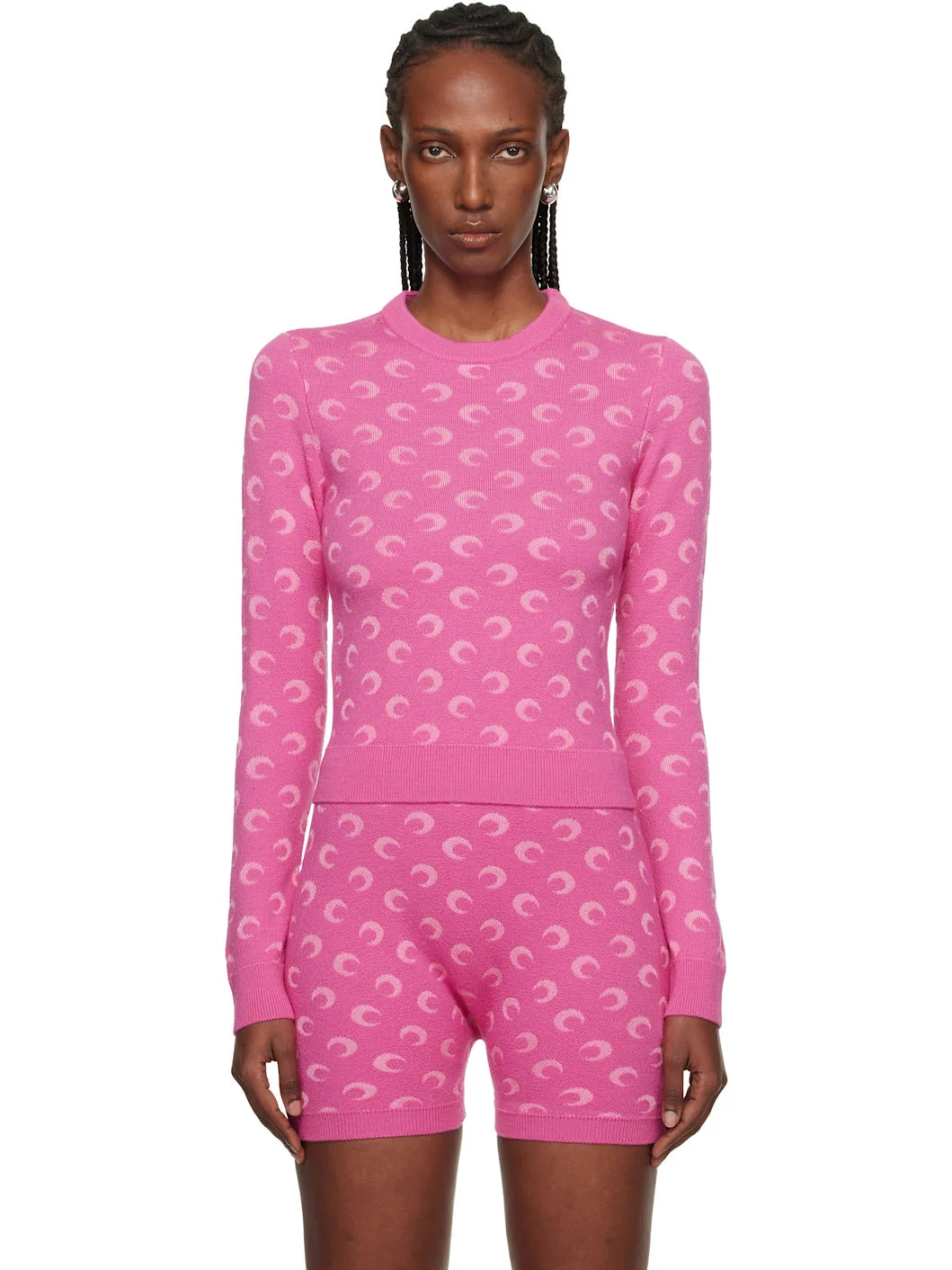 Pink Moon Jacquard Knit Fitted Crewneck Sweater