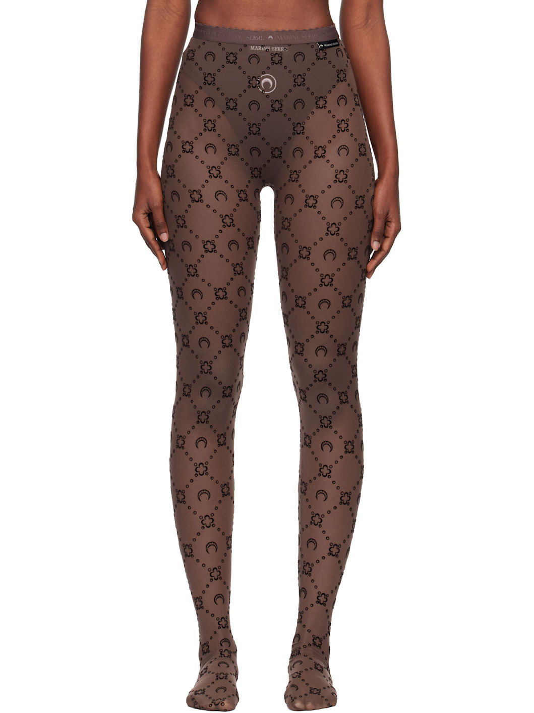 Sheer stretch recycled nylon mesh tights. · Logo pattern flocked throughout · High-rise · Scalloped edge at logo-woven elasticized waistband · Logo flag at front · Integrated feet Available exclusively at SSENSE. Supplier color: Chocolate 86% recycled polyamide, 14% elastane. Made in France 252020F111006