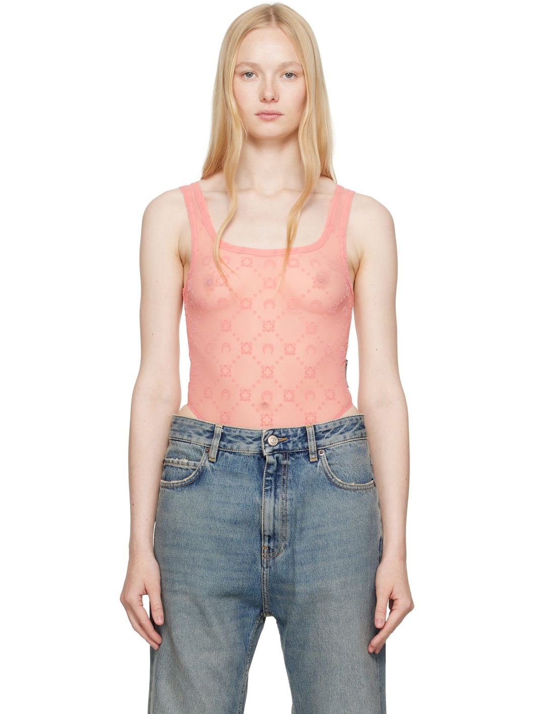 Semi-sheer stretch recycled nylon mesh bodysuit. Logo pattern flocked throughout. · GRS-certified nylon · Scoop neck · Press-stud fastening at bottom · Logo flag at side seam · Low back Available exclusively at SSENSE. Supplier color: Moonogram flamingo pink 86% recycled polyamide, 14% elastane. Made in Italy 251020F358005
