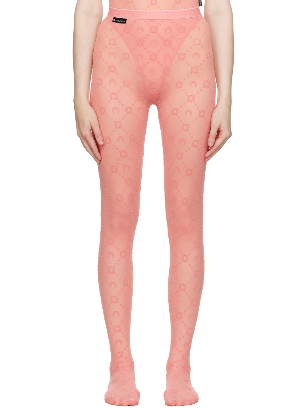 Semi-sheer stretch recycled nylon mesh tights in pink. · GRS-certified nylon · Logo pattern flocked throughout · Logo-woven elasticized waistband · Logo flag at front · Integrated feet Available exclusively at SSENSE. Supplier color: Moonogram flamingo pink 86% recycled polyamide, 14% elastane. Made in France 251020F085008