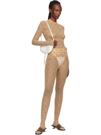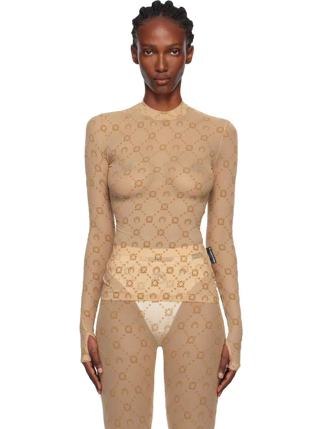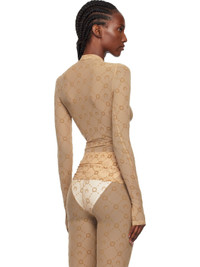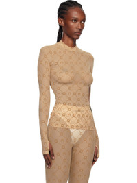 Sheer stretch recycled nylon mesh top. · Logo pattern flocked throughout · Mock neck · Logo flag at side seam Supplier color: Camel 86% recycled polyamide, 14% elastane. Made in France 252020F099001