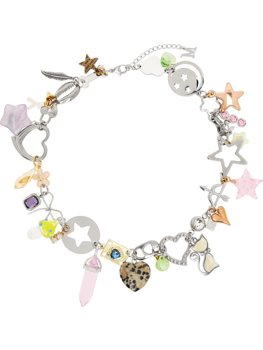 Modified cable chain necklace in silver- and gold-tone stainless steel. · Graphic charms and crystals throughout · Logo charm at adjustable lobster-clasp fastening · L18" Supplier color: Multi Stainless steel, crystal. Made in Australia 252431F023009