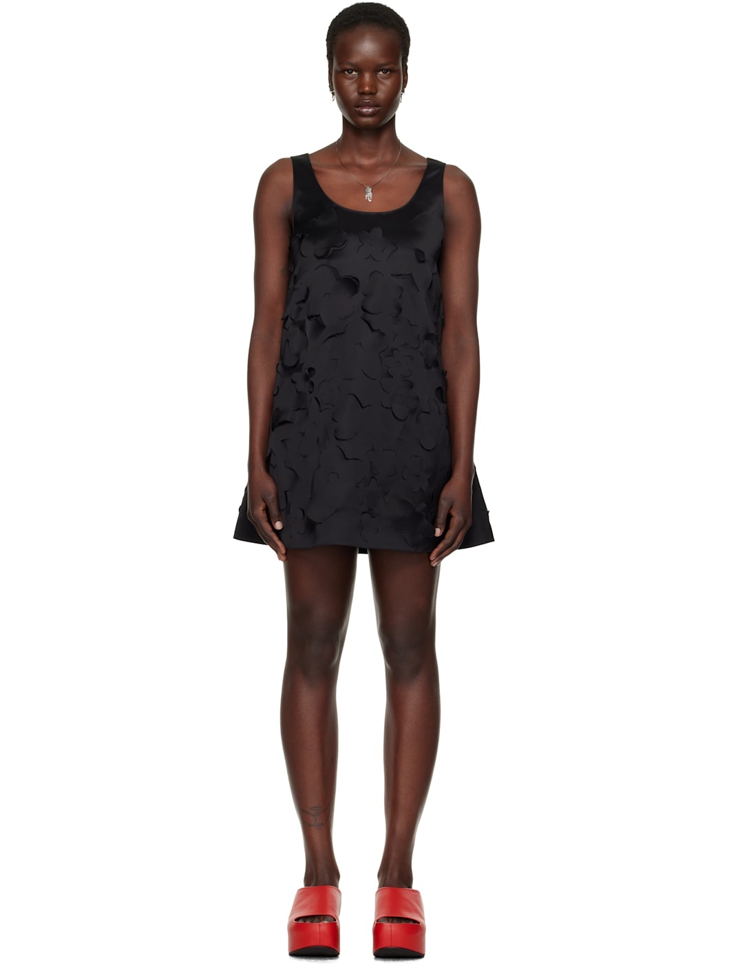 Viscose- and cotton-blend duchess satin minidress. Cutout floral pattern throughout. · Scoop neck · Zip closure at back · Integrated slip-style underlay Supplier color: Black Body 1: 60% viscose, 40% cotton. Body 2: 60% cupro, 40% silk. Made in Italy 251379F052002