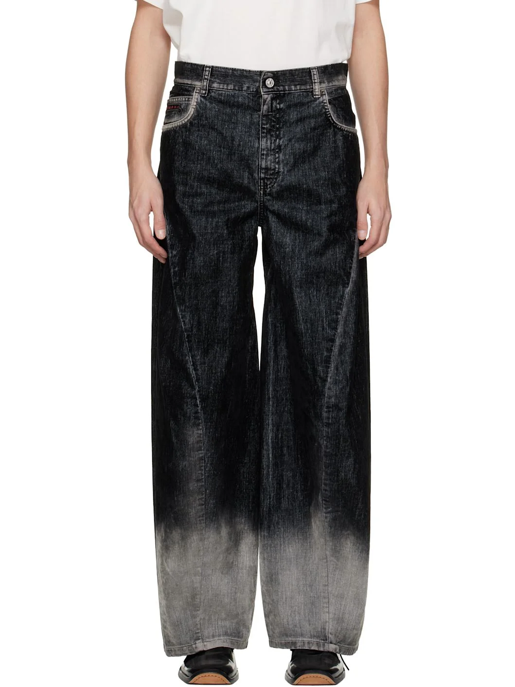 Non-stretch denim jeans. · Flocking and fading throughout · Wide-leg · Belt loops · Five-pocket styling · Zip fly · Logo patch at coin pocket · Twisted outseams · Leather logo patch at back waistband Supplier color: Black Body: 100% cotton. Trim: 100% viscose. Trim 2: 100% split bovine leather. Pocket lining: 100% cotton. Made in Italy 252379M186001