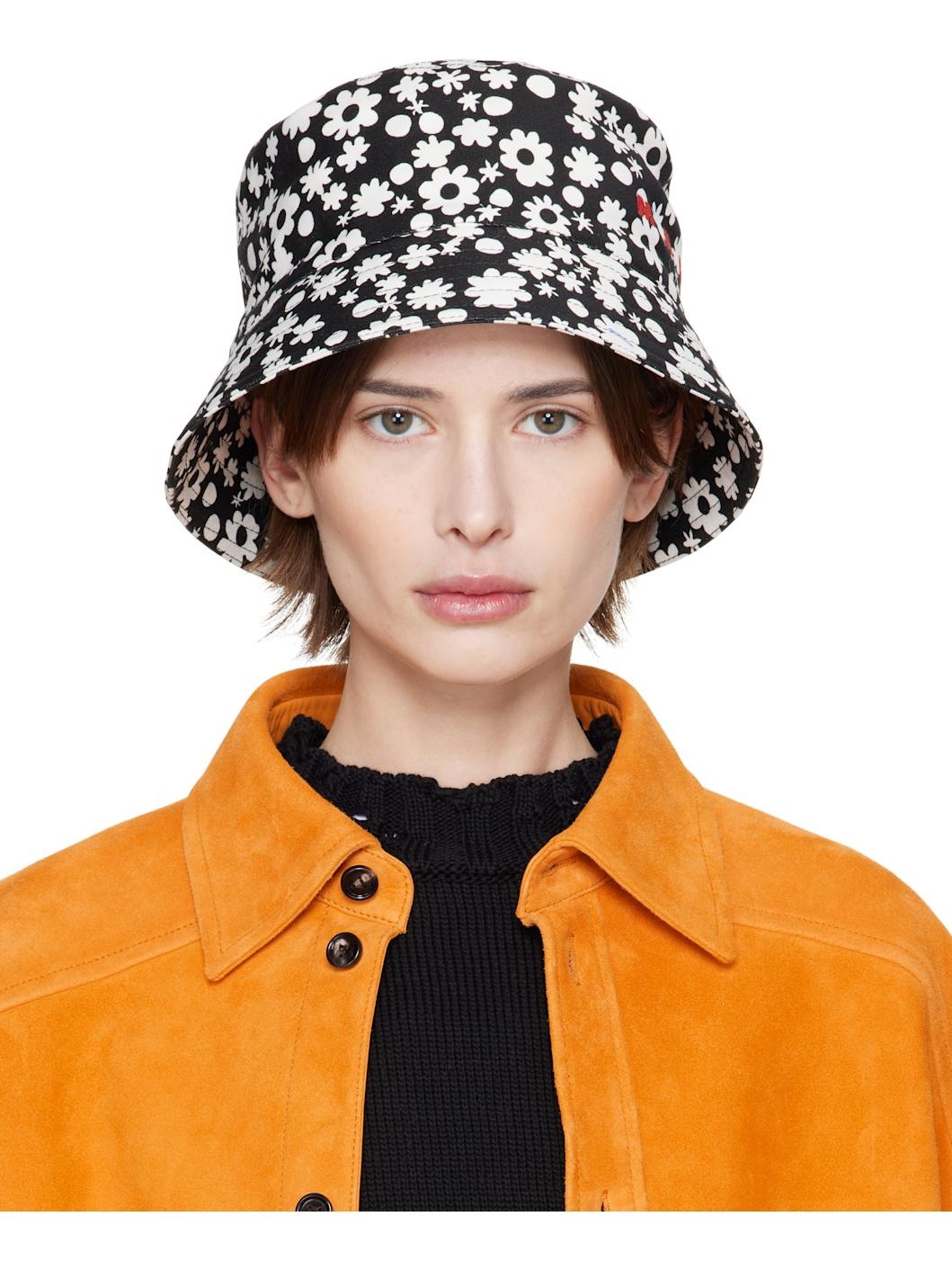Cotton twill bucket hat in black. · Floral pattern printed throughout · Logo embroidered at face · Quilted brim · Grosgrain browband Supplier color: Black 100% cotton. Made in Italy 251379F015001