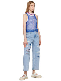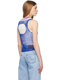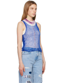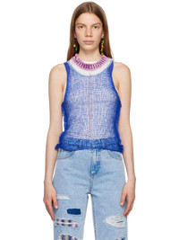 Semi-sheer open knit virgin wool- and cashmere-blend tank top. Viscose- and wool-blend chenille trim at rib knit crewneck. · Raw edge and pinched seam at side seams · Cutout at back Supplier color: Mazarine blue Body: 70% virgin wool, 30% cashmere. Trim: 80% viscose, 20% wool. Made in Italy 231379F111005